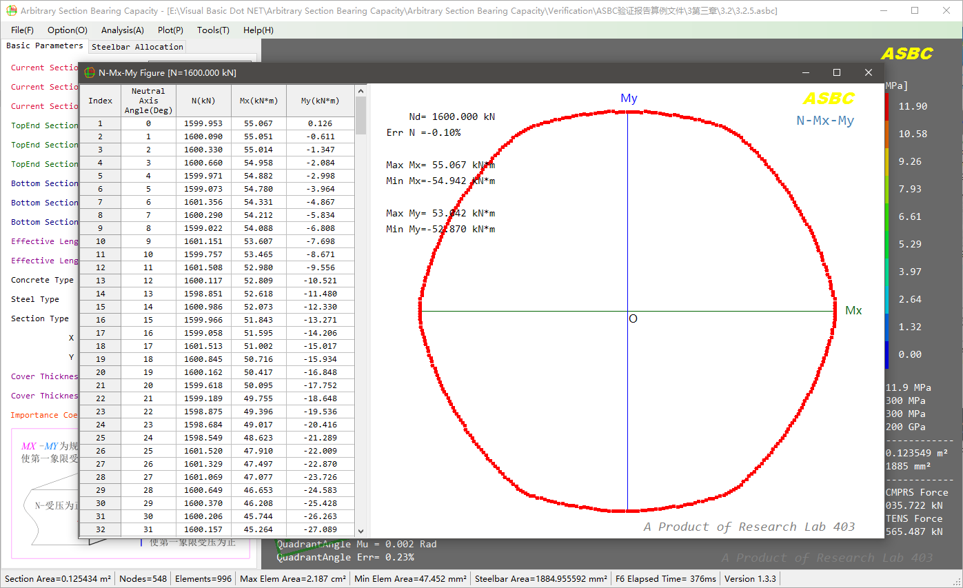 (3)稳定和高效。ASBC历经近100个经典例题的校核,其在轴心受压、轴心受拉、纯弯、单偏压、单偏拉、双偏压和双偏拉情况下的计算准确性得到了验证。ASBC内核模块在PostCTD中历经多个实例冷却塔结构配筋设计过程的验证,具有良好的计算稳定性,单工况平均计算时间约10ms;